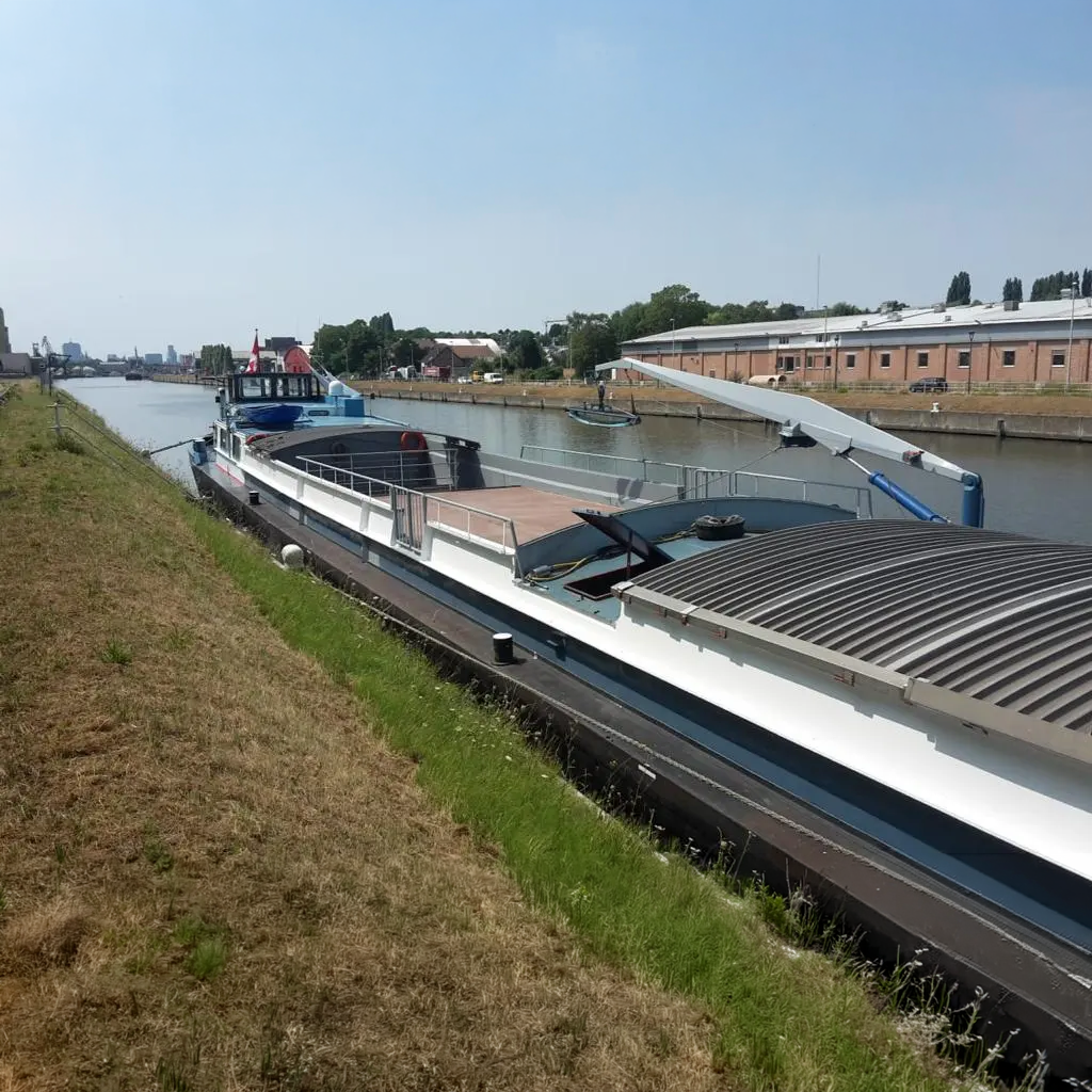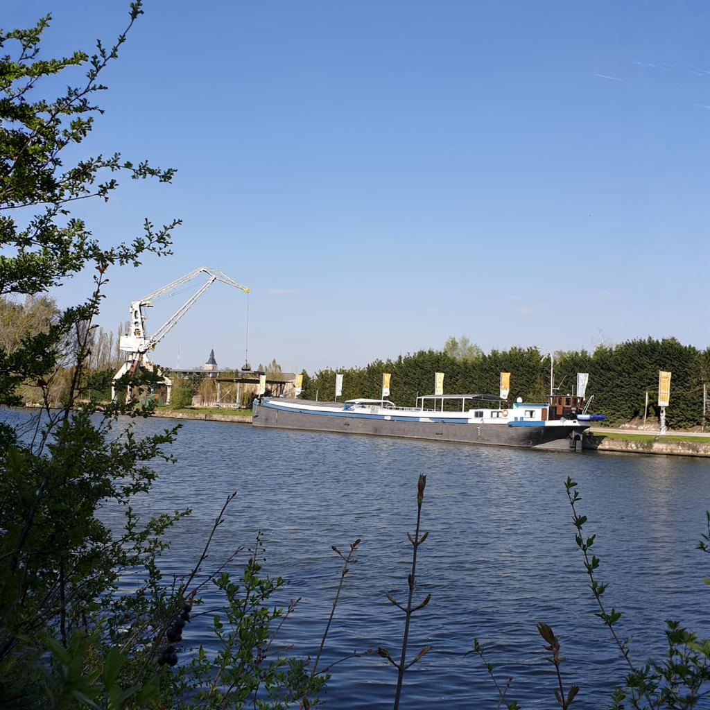 Deze foto is genomen in augustus 2018 tussen Vilvoorde en Brussel toen we de scheepswerf in Boom verlieten na de voornaamste verbouwingswerken: een terras op 3 niveaus en trappen om de grote zaal in het scheepsruim te bereiken.